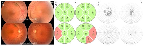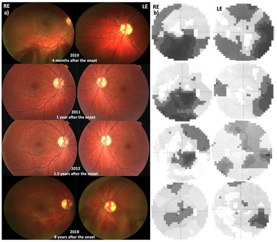 (a) Fundoscopy results during follow-up with the pallor of the optic discs. (b) Visual fields during follow-up. Note: gradual improvement of the visual field over time despite paler discs.