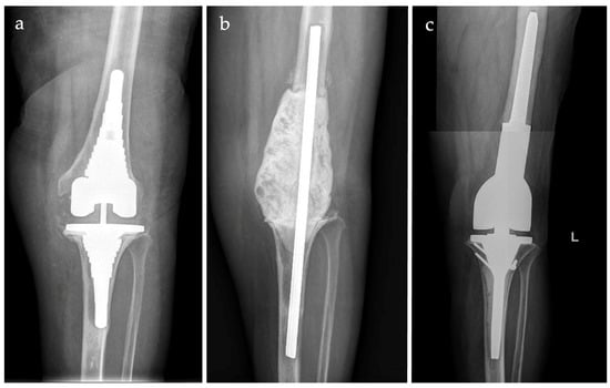 Case of distal femur silver-coated megaprosthesis implantation for periprosthetic joint infection (PJI). Distal femur osteomyelitis with septic loosening of revision knee prosthesis implanted after previous two-stage treatment for PJI (a). Antibiotic-loaded cemented spacer after first-stage (b). Cemented megaprosthesis; tibial tubercle osteotomy (then fixed with screws) was performed to facilitate implant placement considering the severe stiffness after the first-stage procedure (c).
