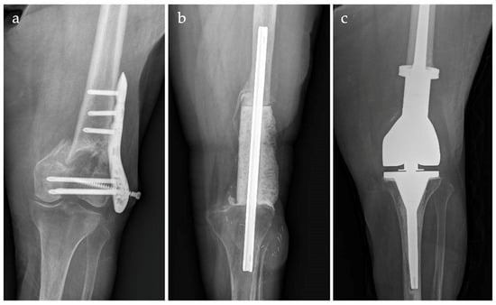 There are various reconstructive strategies to treat bone defects such as autograft and allogeneic bone grafting, bone transport, the use of standard revision prosthesis, and megaprosthesis (MP) [,,,,]. The use of MP, previously reserved for oncological reconstructions, has gradually been extended to non-oncological reconstructions [].