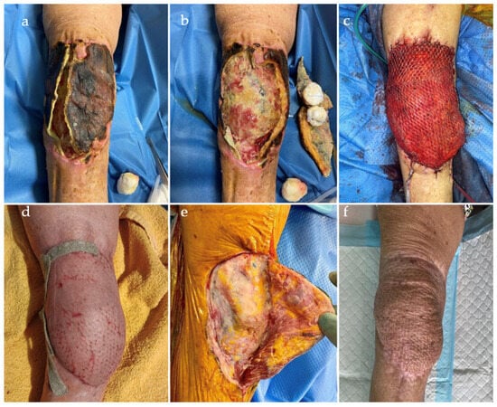 All patients were treated with a staged approach. In details, at the first stage, considering the bone loss and incompetence of the knee stabilizers, a temporary arthrodesis was conducted, using a static, intramedullary spacer, composed of metal rods, covered with antibiotic-loaded polymethylmethacrylate (PMMA). The prosthesis or different hardware was sent for sonication or treatment with dithiothreitol each time []. All infected or necrotic bone was removed, and the soft tissue (ST) was circumferentially debrided. In all cases, bone resection of the distal femur was performed. Specimens were taken from representative areas to perform antibiotic susceptibility test (AST). The full MSIS/FRI criteria for infection were met in all patients. In the case of a fistula, the sinus tract was always completely excised, and the tissue sent for histological examination. At the time of the first stage, in the case of severe ST injuries, orthoplastic coverage procedures were associated: rotational gastrocnemius flap or vascularized free flap (anterolateral thigh perforator flap or latissimus dorsi free flap, with both arterial and venous anastomosis to the geniculate vessels), depending on the characteristics of the individual case (Figure 3a–f).