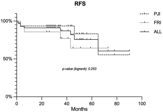 Kaplan–Mayer curve representing the estimated RFS for the entire study cohort and for the PJI and FRI subgroups. Abbreviations: RFS, recurrence free survival; PJI, periprosthetic joint infection; FRI, fracture-related infection.