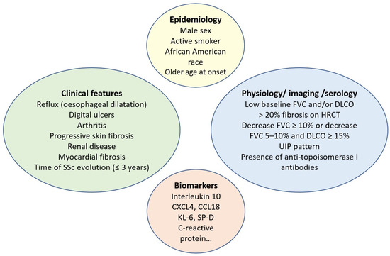 - Distler, O.; Assassi, S.; Cottin, V.; Cutolo, M.; Danoff, S.K.; Denton, C.P.; Distler, J.H.W.; Hoffmann-Vold, A.M.; Johnson, S.R.; Müller Ladner, U.; et al. Predictors of progression in systemic sclerosis patients with interstitial lung disease. Eur. Respir. J. 2020, 55, 1902026. [Google Scholar] [CrossRef] [PubMed]