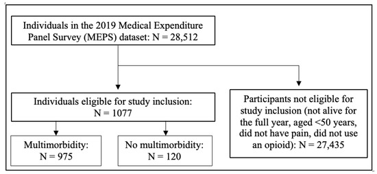 This study applied a cross-sectional retrospective design that utilized 2019 Medical Expenditure Panel Survey (MEPS) data. The MEPS comprises substantial surveys questioning individual people, their families, their medical providers, and their employers throughout the US. The MEPS collects information on health service consumption by Americans, including the frequency of service use, cost of service use, and payment methods for service use. The MEPS also contains comprehensive information about the breadth and cost of health insurance utilized by Americans. The MEPS has three principal constituents: the Household component, the Insurance component, and the Medical Provider component. The Household component was utilized in this study, which pertains to data from all members in a residence. These data may be supplemented with that from healthcare providers in the Medical Provider component. The Household component collects data from all members in a residence obtained from a selection of residences included in the sampling framework from the previous year’s National Health Interview Survey (NHIS). During interviews, characteristics that are collected include demographics, health conditions and status, medical service utilization, payment charges and sources, healthcare access, healthcare satisfaction, healthcare coverage, employment information, and income. These data are collected telephonically over two calendar years [22]. The 2019 full-year consolidated data file (HC-216) utilized for this study contains data for 28,512 individuals and is publicly accessible to researchers [23,24]. Study subjects had to be alive for the entire 2019 calendar year in the US, be aged 50 years and older, have self-reported pain interference in the previous four weeks, and have reported using at least one opioid in 2019. Pain was identified using the following item: during the past four weeks, how much did pain interfere with your normal work (including work outside the home and housework)? This item had response options of not at all, little bit, moderately, quite a bit, and extremely. In this study, an individual was determined to have pain if they responded with anything other than not at all. Use of at least one opioid was identified in the 2019 MEPS prescribed medicines file (HC-213A) using Multum Lexicon therapeutic class codes for opioids (code 60) and combination opioids (code 191) [25,26].