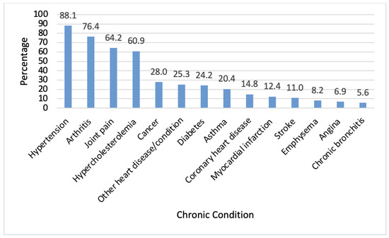 The most common chronic conditions reported were hypertension (88.1%), followed by arthritis (76.4%), joint pain (64.2%), and hypercholesterolemia (60.9%). Less common conditions included cancer (28.0%), other heart diseases (25.3%), diabetes (24.2%), and asthma (20.4%). The remaining conditions were reported by less than 15% of the population. (Figure 2).