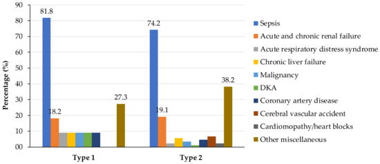 In this study, 11 participants (11.0%) had T1DM, while the majority, 89.0%, had T2DM. Notably, the analysis revealed no significant disparities in terms of contributing factors to mortality causes. However, it is worth noting that sepsis demonstrated a slightly higher occurrence in individuals with T1DM compared to those with T2DM. Renal failure emerged as a common factor across both types of diabetes, implying that it contributed to mortality in both cases. Notably, diabetic ketoacidosis (DKA) was more prevalent in participants with T1DM. Additionally, the study noted that the participants with T2DM had higher incidences of various other miscellaneous factors contributing to mortality (Figure 2).