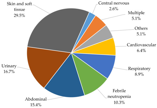 Upon further analysis, sepsis emerged as the leading cause of mortality. One-third of sepsis cases (29.5%) were attributed to skin and soft tissue infections, making it a significant contributor (Figure 3). Additionally, urinary tract infections (UTIs) and abdominal infections were prominent causes, accounting for 16.7% and 15.4%, respectively. Delving deeper into skin and soft tissue infections, cellulitis (52.2%), and paraproctitis (21.7%) were identified as primary culprits. In UTIs, pyelonephritis (53.9%) and renal abscesses (23.1%) were the predominant issues. In the realm of abdominal infections, cases included cholecystitis, pancreatitis, appendicitis, and others. Notably, infections related to malignancies were prevalent, constituting 10.3% of cases. Respiratory infections primarily manifested as pneumonia (71.4%). Interestingly, cardiovascular infections were not initially diagnosed as myocarditis or similar conditions but were associated with infarcts, possibly as a consequence. Similar scenarios were observed in central nervous system infections, which often occurred post stroke. Other contributing factors encompassed bone and joint infections.