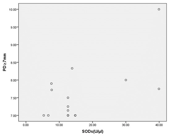 Correlation between deep pocket depth (PD ≥ 7 mm) and SOD level in the saliva of patients assigned to the periodontitis group at baseline. Statistically significant at p < 0.01; PD ≥ 7 mm, deep pocket; SODs, superoxide dismutase value in saliva.
