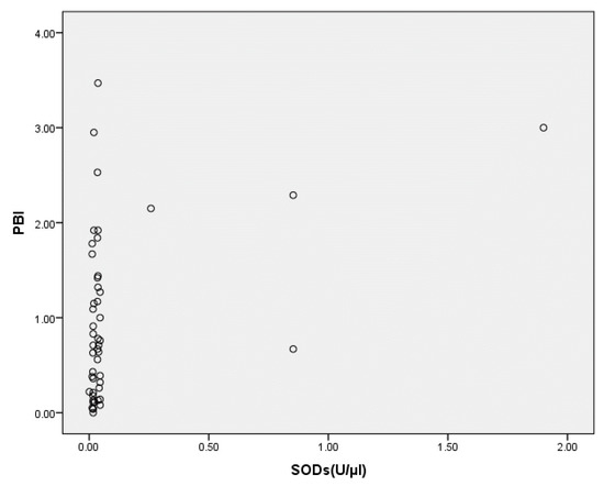 As can be seen from the results reported in Table 4, salivary SOD was positively correlated with the presence of deep periodontal pockets (i.e., those with PD ≥ 7 mm, p = 0.008) (Figure 1), while the correlation with PBI was close to statistical significance (p = 0.056) (Figure 2).