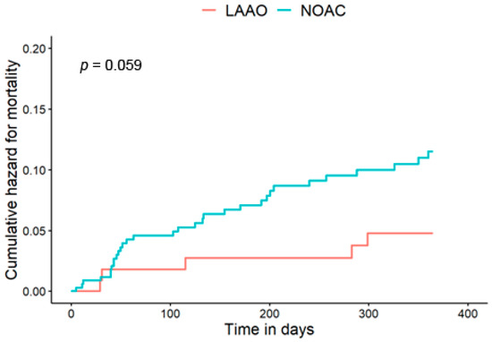 Kaplan-Meier curves comparing 1-year mortality of LAAO vs. NOACs. LAAO: Left Atrial Appendage Occlusion; NOACs: Novel Oral Anticoagulants.