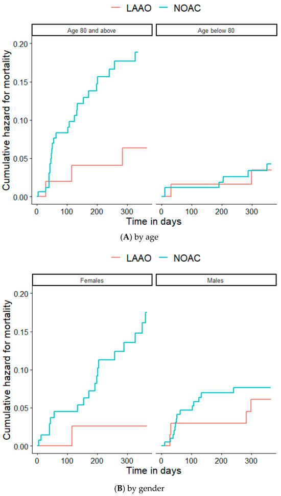 The results demonstrate that 1-year mortality is reduced in LAAO patients compared to NOACs, consistent with previous studies with propensity score-matched populations [24]. This finding also aligned with the PLAATO study (4.39% in the current study vs. 5.4% in PLAATO). The stroke rate in one year for the LAAO group presented in our study was comparable to the reported rate in PLAATO (1.75% vs. 1.8%, respectively). These results further support previous experience with LAAO regarding safety and efficacy in preventing stroke as reported based on the Amulet observational registry [18]. Another propensity-score matched study, which included patients with a previous ischemic stroke, compared 299 patients who underwent LAAO occlusion to 301 patients who received NOACs [29]. This analysis yielded a significantly lower (HR = 0.48) risk of the primary composite outcome of ischemic stroke, major bleeding, and all-cause mortality. The authors reported a surprisingly high rate of NOAC discontinuation of nearly 50% in 2 years. They stated that this may be one of the possible mechanisms that created differences between study arms. In a recently published real-world comparative analysis of Medicare claims data, LAAO implantation was associated with reduced risk for death, stroke, and long-term bleeding [30]. Our study correlates well with these results; however, we used a different study design—the matching ratio of 1:3 (LAAO:NOACs) vs. 1:1 in this study, and we also used the subdivision for renal failure and elderly age, whilst in the other study the gender effect was emphasized.