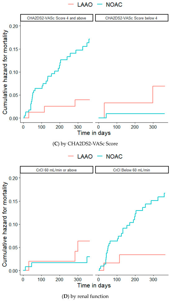 The following supporting information can be downloaded at https://www.mdpi.com/article/10.3390/jcm12206693/s1. Table S1—Baseline characteristics of study participants with CrCl <= 60 mL/min, Table S2—The association between LAAO vs. NOACs and 1-year mortality – stratification by distinct groups.