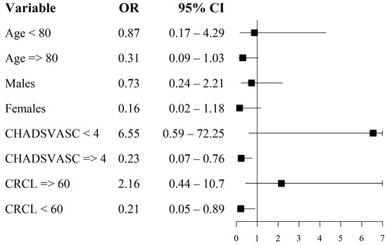 Table 2 shows the multivariable Cox proportional hazard analysis results by group while adjusting for age, sex, hypertension, diabetes mellitus, ischemic heart disease, heart failure, prior bleeding, prior stroke or TIA, renal function, CHA2DS2-VASc, and HAS-BLED scores as well as prior aspirin treatment. LAAO implantation was significantly associated with reduced risk for 1-year mortality (HR 0.38, 95%CI 0.14–0.99) compared to treatment with NOACs. Interestingly, in the subgroup analysis (Figure 3), those who underwent LAAO implantation with CrCl of <60 mL/min, CHA2DS2-VASc score ≥ 4, and/or those who were on a reduced NOAC dose presented with a significantly lower adjusted risk for 1-year mortality (HR 0.21, 0.23 and 0.3, respectively).