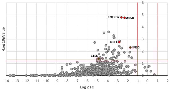 Overall, 595 out of the 1113 tested peptides were reliably detected. Figure 1 shows the volcano plot of concentration changes for the 595 detected proteins in the whole cohort. As depicted, most proteins showed a reduction in their CSF concentration after 6 months of treatment with nusinersen, with 43 proteins showing a statistically significant reduction (see Supplementary Table S1). Gene ontology and pathway analysis identified that factors that significantly changed after treatment were linked to neuronal processes/CNS. KEGG analysis suggested an effect on lysosomal function.