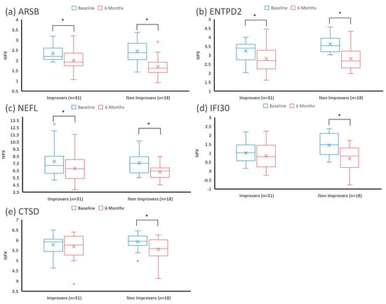 Boxplots of the CSF concentrations of the top proteins and CTSD at baseline and after 6 months of nusinersen treatment in patients showing motor improvement vs. no motor improvement. First quartile, median, and third quartile are marked with horizontal lines, mean is marked with an X, and data spread is shown with the whiskers (1.5*IQR, adjusted for skewness). Concentrations of (a) ARSB, (b) ENTPD2, (c) NEFL, (d) IFI30, and (e) CSTD are represented. All these proteins decreased after nusinersen treatment. Statistically significant differences (p < 0.05) are marked with a *.
