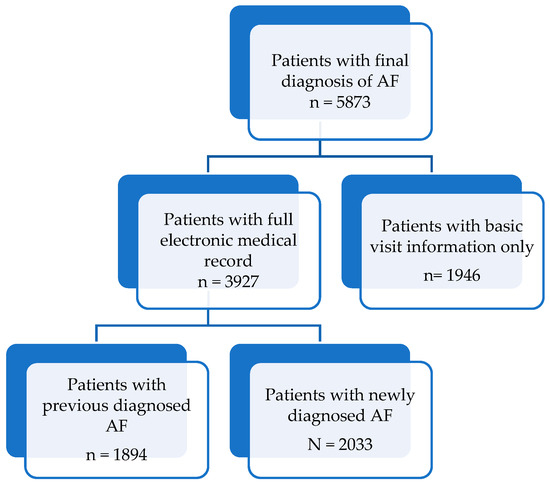 We included patients who presented to a UCC between 1 January 2010 and 31 December 2021 and who had a final diagnosis of AF. Only patients who were 18 years or older were included in the study. AF diagnosis was based on the treating physician’s electrocardiography (ECG) interpretation. There were 5873 visits meeting the inclusion criteria, of which 3927 had electronic medical records (Figure 1).