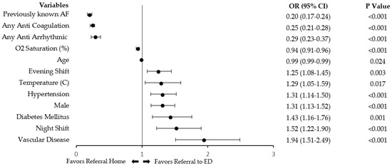 Plot listing pre–specified significant variables in the univariate analysis predicting referral to ED. Black dots represent OR with lines showing 95% CI. ED, emergency department; OR, odds ratio; CI, confidence interval; AF, atrial fibrillation.