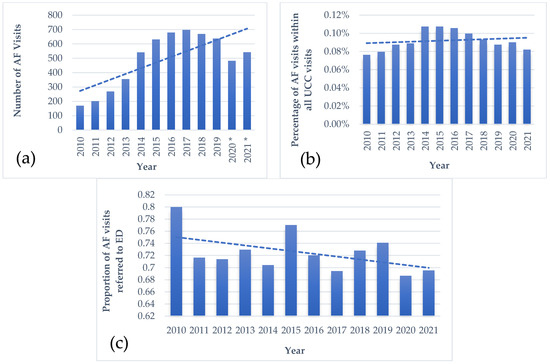 (a) Graphical display of the number of visits with primary diagnosis of AF per year. p-Value for trend = 0.011; (b) Graphical display of the proportion of AF visits within all visits to UCC by year. p-Value for trend = 0.303; (c) Graphical display of the proportion of patients diagnosed with AF referred to the ED by year. p-Value for trend = 0.050. * Indicates the years of the COVID-19 pandemic. Dashed lines indicate linear trendlines. AF, atrial fibrillation; ED, emergency department.