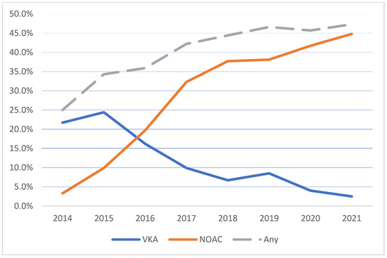 During 2014–2021, the rate of NOAC therapy consistently increased (p < 0.001) and that of VKA therapy decreased (p < 0.001) (Figure 4). Among the patients eligible for AC therapy with CHA2DS2-VASc score ≥ 2, the rate of AC was 61.9% in the final year of this study.