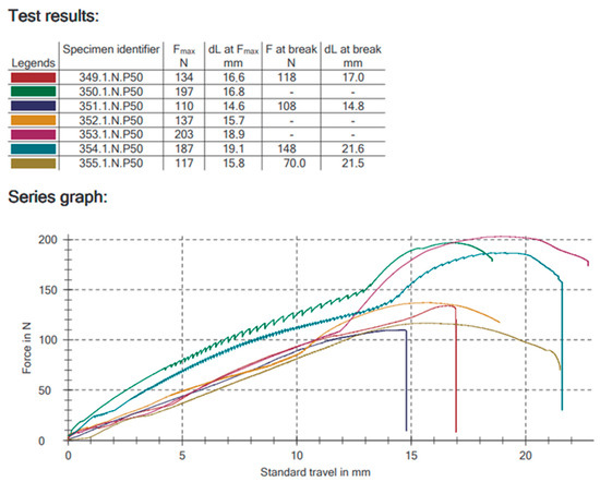 All tests were carried out by the authors at the Material Science Laboratory of the Medical University of Lodz, Poland. For the strength tests, a Zwick Roell Z020 universal testing machine was used (Zwick-Roell, Ulm, Germany). The initial applied force to the condyle was 1 N and then increased according to the piston travel down of 1 mm per minute. The test was terminated when a plate fractured, a condyle broke, a screw pulled out, or the deformation of the system was so severe that the condyle rested against the base of the machine. Instron software dedicated to the machine (testXpert II V3.31, Zwick Roell, Ulm, Germany) was used to record the results. The relationship between the applied force (Fmax [N]) and the displacement of the piston (dL at Fmax [mm]), the load when permanent deformation occurred Fmax [N]), the maximum load at fracture (F at break [N]), and the displacement of the piston during the maximum load at fracture (dL at break [N]) were recorded (Figure 2). The maximum force required to displace the condyle by 1 mm in the entire study group was 15.23 ± 3.53 N.