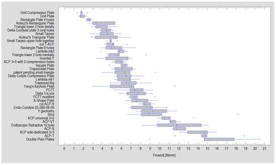 Table 1 presents the test results for each of the 37 plate models. The average force required to displace the condylar process fixation by 1 mm was 7.26 ± 3.61 N, with a median of 6.56 N. This value is significantly lower than that for the intact mandibular model, which measured 28.33 ± 3.16 N (Mann–Whitney (Wilcoxon) test; p < 0.001).
