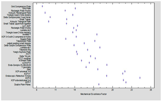 Figure 4 illustrates the relationship between the plate designs and the Mechanical Excellence Factor (MEF), denoted by thick vertical lines on the graph. A general trend shows that plate rigidity increases with a higher MEF value.