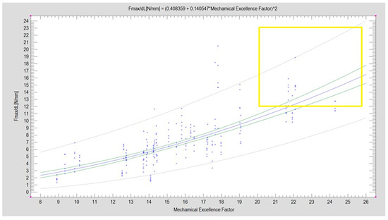 Plate designs with an MEF greater than 20 are considered promising, while those achieving a force sufficient to displace segments by 1 mm above 12 N are categorized as strong (see Figure 5). The dataset encompasses all experimental results collected (259 experiments). The two characteristics have a moderately strong correlation (CC = 0.77), and the mathematical model accounts for a significant portion of the observations (R2 = 60%). The blue line represents the regression equation plot, with the points indicating the experimental results obtained. The green lines mark the 95% confidence limits, while the gray lines indicate the prediction limits. Notably, there are designs with promising construction features (MEF > 20) and high-stability fixation capabilities (Fmax/dL > 12N), with some overlap between the two sets (indicated by a yellow box).