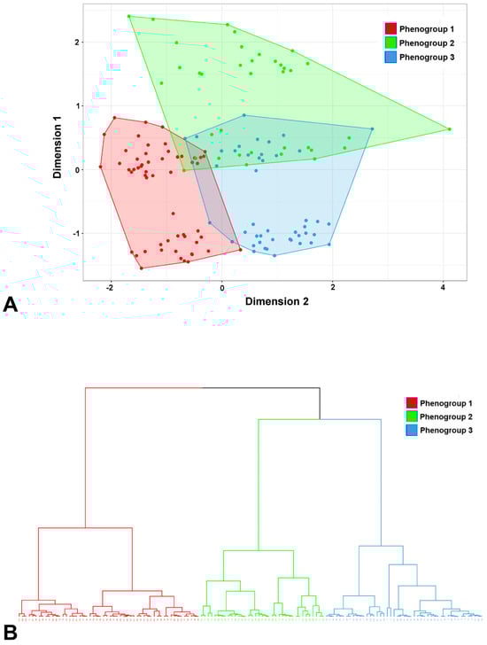 In the second step, the hierarchical clustering algorithm was applied to the principal component space []. The data points were grouped into phenogroups based on their proximity in the principal component space. The Euclidean distance, based on the concept of Euclidean geometry, where distances are measured along straight paths, was employed to determine the similarity between pairs of data points. This information was crucial for constructing the dendrogram, which visually represents the clustering process and enables the identification of phenogroups at different levels of similarity. Ward’s method was used to build the dendrogram tree.