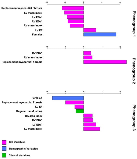 Nine input variables contributed differently to the definition of the patient’s phenogroups (Figure 2). Age, hematochemical parameters, hepatic and cardiac iron levels, left trial area index, and RV EF did not contribute. Table 3 shows the differences among the three phenogroups.