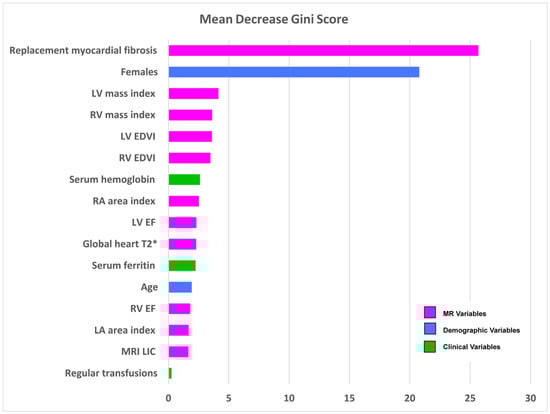 In the supervised RF analysis, sex and replacement myocardial fibrosis by LGE emerged as the key parameters that significantly contributed to the differentiation of patients in each phenogroup (Figure 3). The presence of regular transfusions was associated with the lower mean Gini index.