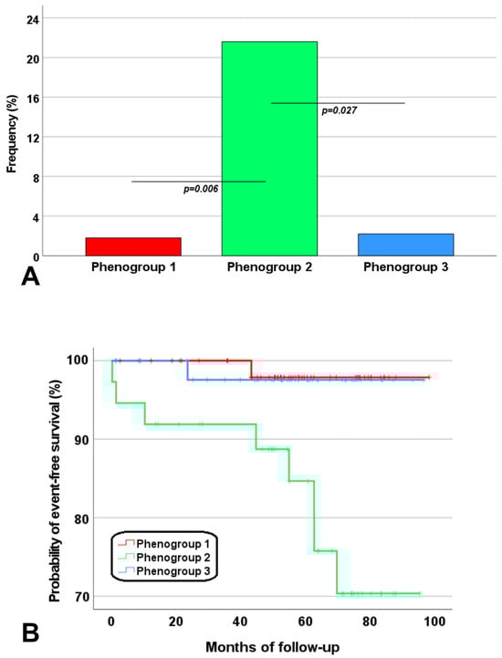The prevalence of cardiovascular events was significantly higher in phenogroup 2 than in both phenogroup 1 (21.6% vs. 1.8%; p = 0.006) and phenogroup 3 (21.6% vs. 2.2%; p = 0.027) (Figure 4A). Phenogroup 2 was associated with a significantly increased risk of cardiovascular complications compared with phenogroup 1 (HR = 10.5, 95%CI = 1.3–83.9; p = 0.027) as well as phenogroup 3 (HR = 9.0, 95%CI = 1.1–72.1; p = 0.038). Figure 4B shows the Kaplan–Meier curve. The log-rank test demonstrated significant differences in the occurrence of cardiovascular complications across phenogroups (p = 0.002).