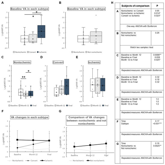 Change in logarithm of the minimal angle of resolution (LogMAR) visual acuity (VA) by subtypes of central retinal vein occlusion. (A) Baseline LogMAR VA in each subtype. Significant difference was found between nonischemic and ischemic types (p = 0.014 *), or convert (converted from nonischemic to ischemic) and ischemic types (p = 0.023 *). No significant difference was found between nonischemic type and convert type (p = 0.95). (B) A comparison of baseline LogMAR VA between nonischemic type and the others (not nonischemic). There was no significant difference between the groups (p = 0.26). (C–E) Changes in LogMAR VA in each subtype. (C) Nonischemic type. There was significant difference in LogMAR VA between baseline and month 12 (p = 0.0086), or month 12 and final (p = 0.025), and no significant difference between baseline and final (p = 0.058). (D) Convert type. There were no significant differences over time. (E) Ischemic type. There were no significant differences over time. (F,G) Comparison of LogMAR VA changes in each subtype (F) and between nonischemic or not (G). VA changes over time were not significantly different in each subtype (F) (p = 0.17) or between nonischemic and not nonischemic (G) (p = 0.16). In contrast, VA changes in each subtype (F) and between nonischemic and not nonischemic (G) were significantly different (p < 0.001, p = 0.0025, respectively). (H) Statistical methods used in (A) through (G) and the p-values. ANOVA = analysis of variance. * p < 0.05, ** p < 0.01, *** p < 0.001.