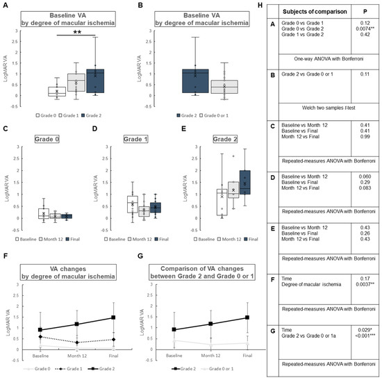 Change in logarithm of the minimal angle of resolution (LogMAR) visual acuity (VA) by degree of macular ischemia in central retinal vein occlusion. Grade 0: no macular ischemia, Grade 1: mild macular ischemia, Grade 2: severe macular ischemia. (A) Baseline LogMAR VA by degree of macular ischemia. There was significant difference in baseline LogMAR VA between those without macular ischemia (Grade 0) and those with severe macular ischemia (Grade 2) (p = 0.0074), but not between those without macular ischemia (Grade 0) and those with mild ischemia (Grade 1) (p = 0.12), or those with mild ischemia (Grade 1) and those with severe ischemia (Grade 2) (p = 0.42). (B) A comparison of baseline LogMAR VA between those with severe macular ischemia (Grade 2) and the others (Grade 0 or 1). There was no significant difference between the groups (p = 0.11). (C–E) Changes in LogMAR VA by degree of macular ischemia. (C) No macular ischemia group (Grade 0). There were no significant differences over time. (D) Mild macular ischemia group (Grade 1). There were no significant differences over time. (E) Severe macular ischemia group (Grade 2). There were no significant differences over time. (F,G) Comparison of LogMAR VA changes by degree of macular ischemia (F) and between severe macular ischemia (Grade 2) or not (Grade 0 or 1) (G). VA changes over time were not significantly different by degree of macular ischemia (F) (p = 0.17) but were significantly different between Grade 2 and Grade 0 or 1 (G) (p = 0.029). There was significant difference in VA changes by degree of macular ischemia (F) (p = 0.0037), or between Grade 2 and Grade 0 or 1 (G) (p < 0.001). (H) Statistical methods used in (A) through (G) and the p-values. ANOVA = analysis of variance. * p < 0.05, ** p < 0.01, *** p < 0.001.