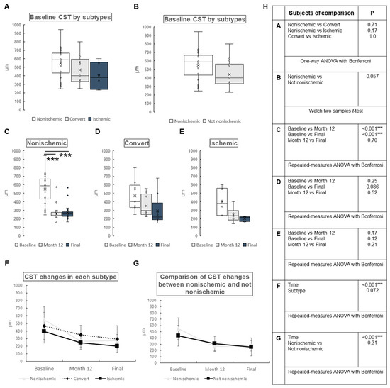 CST: The mean CST for all patients was 507 ± 176, 282 ± 95.4, and 268 ± 107 µm at baseline, month 12, and final visit, respectively. Significant differences were found between baseline and month 12 (p < 0.001), and baseline and final (p < 0.001), but not between month 12 and final (p = 0.53). The changes of CST by subtype are shown in Figure 3. At baseline, there were no significant differences in CST among all of the subtypes (Figure 3A). Additionally, no significant difference was found between nonischemic and not nonischemic types (p = 0.057) (Figure 3B). The changes in CST for each subtype are shown in Figure 3C–E. Significant differences were found only in baseline vs. month 12 (p < 0.001) and baseline vs. final (p < 0.001) for the nonischemic type, but not for the other types (Figure 3C–E). CST changes over time for each subtype are presented in Figure 3F,G. CST changes were significantly different over time in Figure 3F (p < 0.001) and Figure 3G (p < 0.001), but were not significantly different by subtype in Figure 3F (p = 0.072) or between nonischemic and not nonischemic in Figure 3G (p = 0.31).