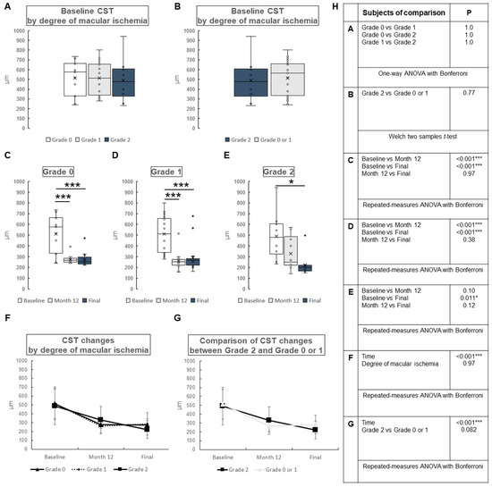 Change in central subfoveal thickness (CST) by degree of macular ischemia in central retinal vein occlusion. Grade 0: no macular ischemia, Grade 1: mild macular ischemia, Grade 2: severe macular ischemia. (A) Baseline CST by degree of macular ischemia. There were no significant differences among all groups. (B) A comparison of baseline CST between those with severe macular ischemia (Grade 2) and the others (Grade 0 or 1). There was no significant difference between the groups (p = 0.77). (C–E) Changes in CST by degree of macular ischemia. (C) No macular ischemia group (Grade 0). There was significant difference between baseline and month 12 (p < 0.001) and between baseline and final (p < 0.001). No significant difference was found between month 12 and final (p = 0.97). (D) Mild macular ischemia group (Grade 1). There was significant difference between baseline and month 12 (p < 0.001) and baseline and final (p < 0.001). No significant difference was found between month 12 and final (p = 0.38). (E) Severe macular ischemia group (Grade 2). There was significant difference between baseline and final (p = 0.011). Significant difference was not found between baseline and month 12 (p = 0.10), or between month 12 and final (p = 0.12). (F,G) Comparison of CST changes by degree of macular ischemia (F) and between Grade 2 and Grade 0 or 1 (G). CST changes over time were significantly different by degree of macular ischemia (F) (p < 0.001) and between Grade 2 and Grade 0 or 1 (G) (p < 0.001). In contrast, CST changes by degree of macular ischemia (F) or between Grade 2 and Grade 0 or 1 (G) were not significantly different (p = 0.97, p = 0.082, respectively). (H) Statistical methods used in (A) through (G) and the p-values. ANOVA = analysis of variance. * p < 0.05, *** p < 0.001.