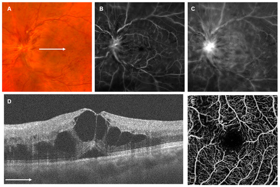 Representative case 1. Seventy-two-year-old male with central retinal vein occlusion in the left eye. (A) Fundus photograph (Optos California). Retinal veins were dilated and tortuous, with numerous retinal hemorrhages. (B,C) Fluorescein angiograms (Optos California). (B) Early phase and (C) late phase. Hyperfluorescence, possibly due to staining, was seen at the disc, and hyperfluorescence, possibly due to pooling, was seen at the macula. Nonperfusion areas were rarely seen and diagnosed as nonischemic. (D) Horizontal scan of optical coherence tomography (OCT) across the fovea (AVANTI OCT). Cystoid macular edema and serous retinal detachment were seen. (E) Superficial capillary layer of 3 × 3 mm OCT angiogram centered on the fovea (RTVue XR Avanti). The retinal vessel density of superficial capillary layer was 43.0% and determined to not be macular ischemia (Grade 0). The white arrows in (A,D) indicate which part of (A) was captured by the OCT image in (D).