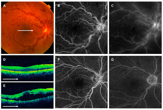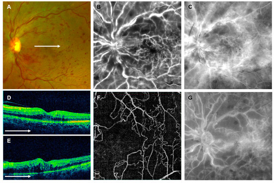 Representative case 3. Sixty-two-year-old male with central retinal vein occlusion in the right eye. (A) Fundus photograph (TRC-50AX). Retinal veins were dilated and tortuous, with numerous retinal hemorrhages. (B,C) Fluorescein angiograms (FAs) (Optos California). (B) Early phase and (C) late phase. Hyperfluorescence, possibly due to staining, was seen at the disc and around the retinal veins. (D,E) Horizontal scans of optical coherence tomography (OCT) across the fovea (Cirrus HD-OCT). (D) Initial visit and (E) two weeks later. Small macular edema (ME) was seen at the initial visit, but the ME was seen to have increased two weeks later. (F,G) FAs (Optos California) at month 4. (F) Early phase and (G) late phase. The hyperfluorescence seen at baseline had almost disappeared, but the macular area was hypofluorescent, with severe macular ischemia (Grade 2). The white arrows in (A,D,E) indicate which part of (A) was captured by the OCT image in (D,E).
