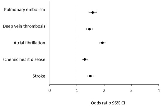 A recent analysis of comorbidities and clinical outcomes performed in 16,374 Swedish adults patients with PHPT showed that the risk of CV events was significantly increased by 45% in patients with PHPT compared with a matched control group [44]. As in the Swedish population, our study performed in the Spanish population also showed an association between PTH and CVDs. We herein report that in our hospital population, the diagnosis of PTH was significantly and independently associated with stroke, ischemic heart disease, atrial fibrillation, deep vein thrombosis, and pulmonary embolism. This is important because, as recently reported, parathyroidectomy appears to be associated with clinical benefit in terms of reduced long-term CV events, even in elderly patients, compared with non-operative management. This finding is relevant for surgical decision making, especially in patients with a long life expectancy [44,48].