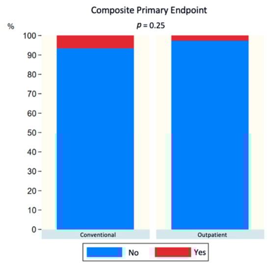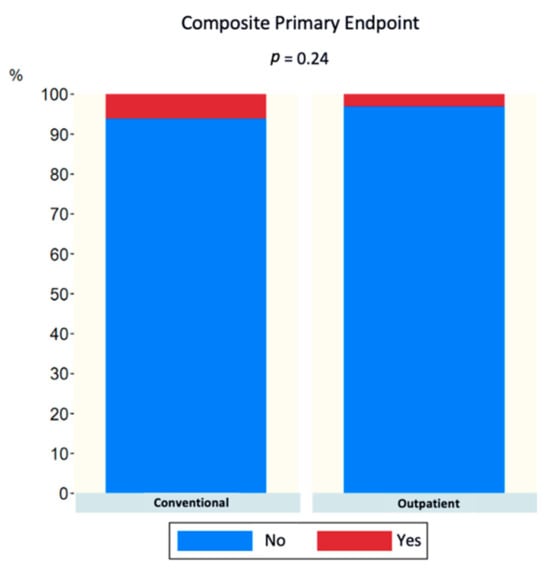 Main Figure: Non-randomized single-center study with two groups, conventional protocol n = 131 and outpatient protocol n = 131 (76 in each group after matching). No differences were observed in the composite primary endpoint.