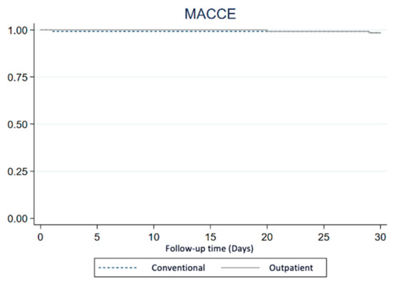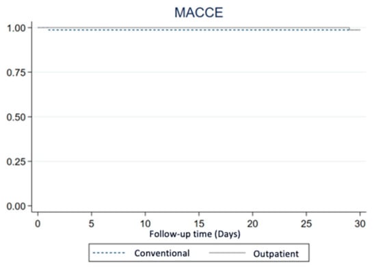 The primary composite endpoint to assess safety and effectiveness was MACCE (death, stroke, and bleeding), together with vascular complications and the need to receive emergency health care within the first 7 days after hospital discharge, analyzed at 30 days. The secondary endpoints were the technical success and procedure success, average length of stay in both groups, and complications during the procedure and the hospital stay.