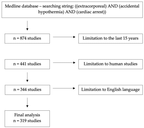 The search of the Medline database was performed on 20 July 2023 using the advanced search option and the following search keywords: ((extracorporeal) AND (accidental hypothermia) AND (cardiac arrest)). The search was limited to the last 15 years and only human studies written in English were included (Figure 1). It should be highlighted that this study is not a systematic review; thus, the search was simplified. Only reports containing significant information on the topic are referred to in this review. Two researchers independently read all the identified papers.