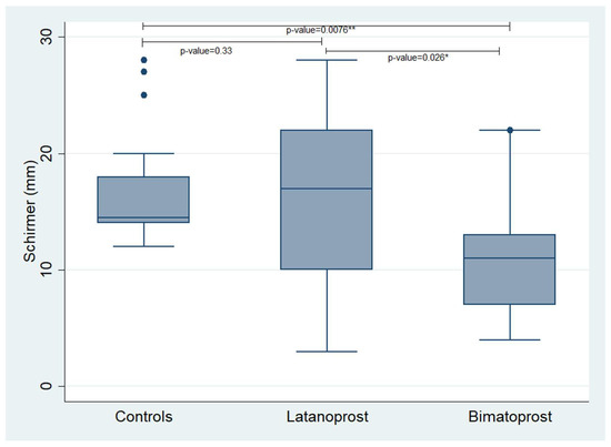 We performed Schirmer’s test and we evaluated the TBUT in all participants enrolled in the study. The Schirmer’s test values revealed a statistically significant difference between the control group and the Bimatoprost PF group, showing that controls had higher values than the glaucoma patients receiving Bimatoprost PF eye drops (p-value = 0.0076). Additionally, there was a statistically significant difference between the Latanoprost PF group and the Bimatoprost PF group, showing that Latanoprost PF users had higher Schirmer’s test values than the Bimatoprost PF users (p-value = 0.026). The difference between the controls and the Latanoprost PF users was not statistically significant.
