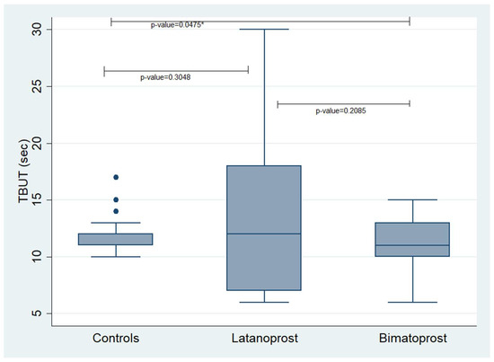 Box plot presenting the values of TBUT in each studied group. TBUT: Tear Break-Up Time. * statistically significant values.