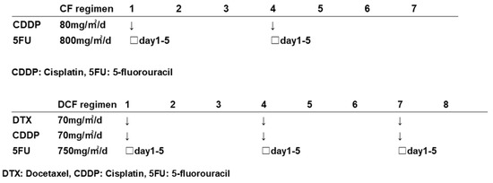 All patients were treated with the DCF regimen (docetaxel, 5-fluorouracil, and cisplatin). The DCF regimen was repeated three times every three weeks as follows: docetaxel at 70 mg/m2 given as a 1-h intravenous infusion on day 1 of each cycle, cisplatin at 70 mg/m2 as a 2-h intravenous infusion on day 1 of each cycle, and 5-fluorouracil at 750 mg/m2 as a continuous infusion on days 1–5. Details of the DCF regimen are presented in Figure 1. The doses used in this study were those used in the JCOG1109 NExT study. Under conditions of tumor progression or chemotherapeutic adverse events, each regimen was performed below the scheduled dose (incomplete cases). All patients received radical subtotal esophagectomy with either two- or three-field lymphadenectomy at least 3–4 weeks after the completion of NAC.