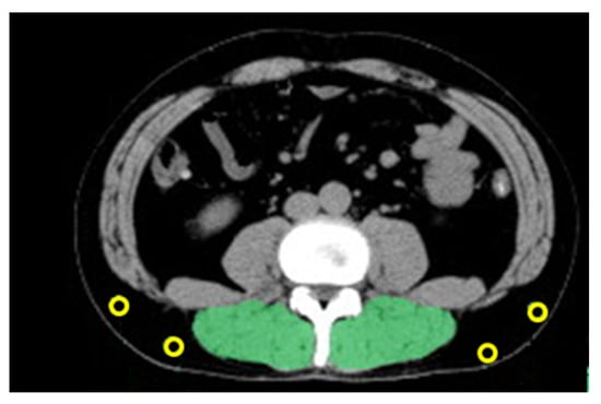 Methods of IMAC measurement. The mean CT value of the multifidus muscle was calculated by green area. The mean CT value of subcutaneous fat was calculated by four small points.