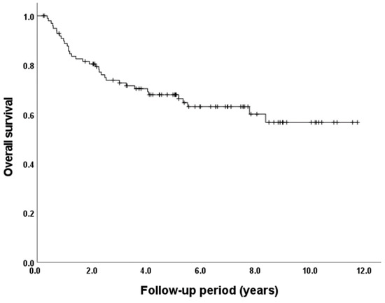 The overall survival rate for all 100 patients was estimated using the Kaplan–Meier method, as shown in Figure 3. The 5-year survival rate was 68.0%.