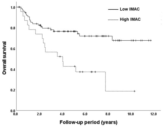 Univariate Cox regression analysis of nine factors indicated that age over 65 and a high IMAC were candidate risk factors. Multivariate Cox regression analysis revealed that a high IMAC was significantly related to death after surgery (p = 0.005, 95% CI 1.343–5.424, hazard ratio 2.699) (Table 3).