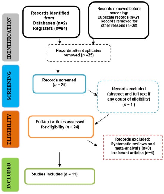 A total of 84 articles were enrolled after applying the search strategy (Table 2). After the elimination of duplicates and eliminating the ones not related to the topic, 25 records were considered for screening. During the first phase, the included articles were selected based on their titles/abstracts and their relation to the study question. Therefore, the screening process generated 25 articles, and 24 publications were further assessed for eligibility. Any disagreements were resolved by discussion and by consultation with a fourth one. Finally, a total of eleven publications were included in this review.