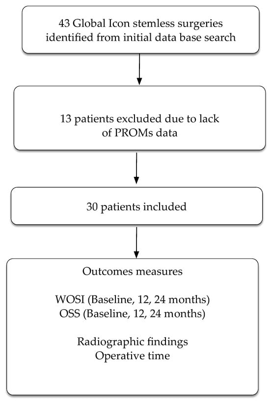 The practice database retrieved 43 participants who had undergone a total shoulder replacement using the Global Icon stemless system. Thirteen participants had no follow-up PROMs, leaving a total of 30 participants included in the study (Figure 2). Glenoid type for the cohort was as follows: type A1: six participants, type A2: eleven participants, type B1: three participants, type B2: five participants, and type C: four participants.