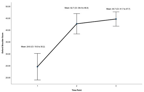 Total Score for the Oxford Shoulder Score (OSS). Timepoint 1 = Baseline, 2 = 12 months, 3 = 24 months. CI = 95% Confidence Interval.