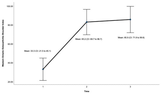 Post-surgery, there was a significant improvement at 24 months on the OSS (ES = 0.932, CI: 41.7 to 47.7, p < 0.001, Figure 3, Table 1) and the WOOS Index (ES = 0.906, CI: 71.9 to 99.8. p < 0.001, Figure 4, Table 1). There was a significant improvement for all sub-sections of the WOOS Index (physical symptoms, sport/recreation/work, lifestyle, and emotions) at 24 months (p < 0.001) (Tables S1 and S2, Supplementary File). Post-hoc analysis (Table 2) revealed a significant improvement between baseline and 12 months for the OSS (ES = 6.9, CI: 12.8 to 23.4, p < 0.001) and the WOSS Index (ES = 16.4 CI: 36 to 63.8, p < 0.001), and baseline and 24 months for the OSS (ES = 5.4, CI = 15.6 to 23.7, p < 0.001) and the WOOS Index (ES = 16.5, CI: 40.7 to 64.5, p < 0.001). There was no significant difference between 12- and 24-month scores for the OSS and the WOOS Index, indicating that most improvements occurred in the first 12 months post-surgery.